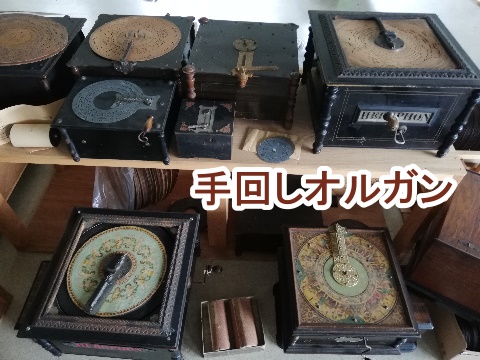 手回しオルガン、自動オルガンと呼ばれるものには 本当に沢山の種類があります。 (写真では、ディスクタイプの手回しオルガンだけを集めて見ました。)